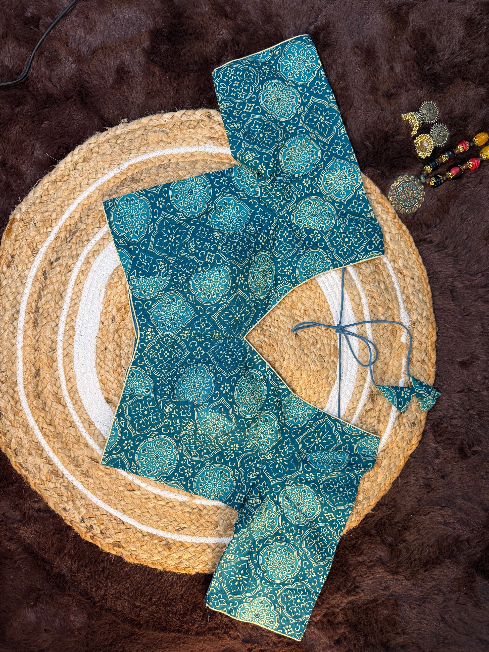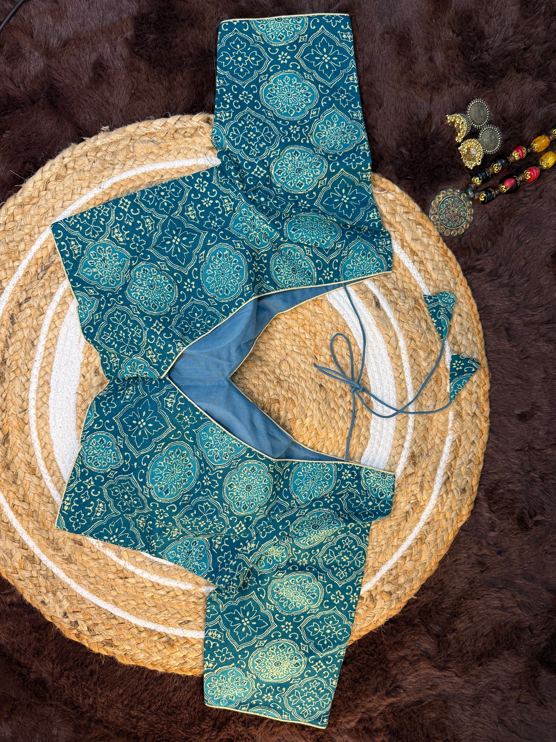 Buy Teal Blue Cotton Printed Blouse with V-Neck and Elbow Sleeves