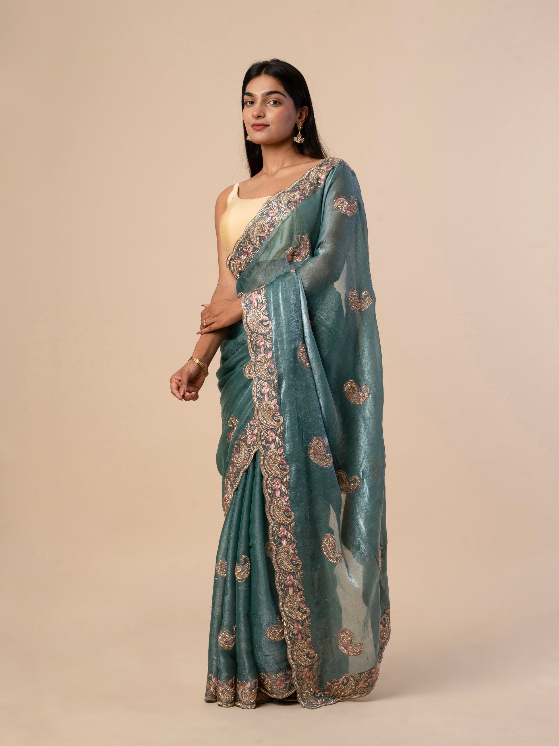 Chiffon Silk Saree with Intricate Paisley Embroidery and Embellished Floral Border
