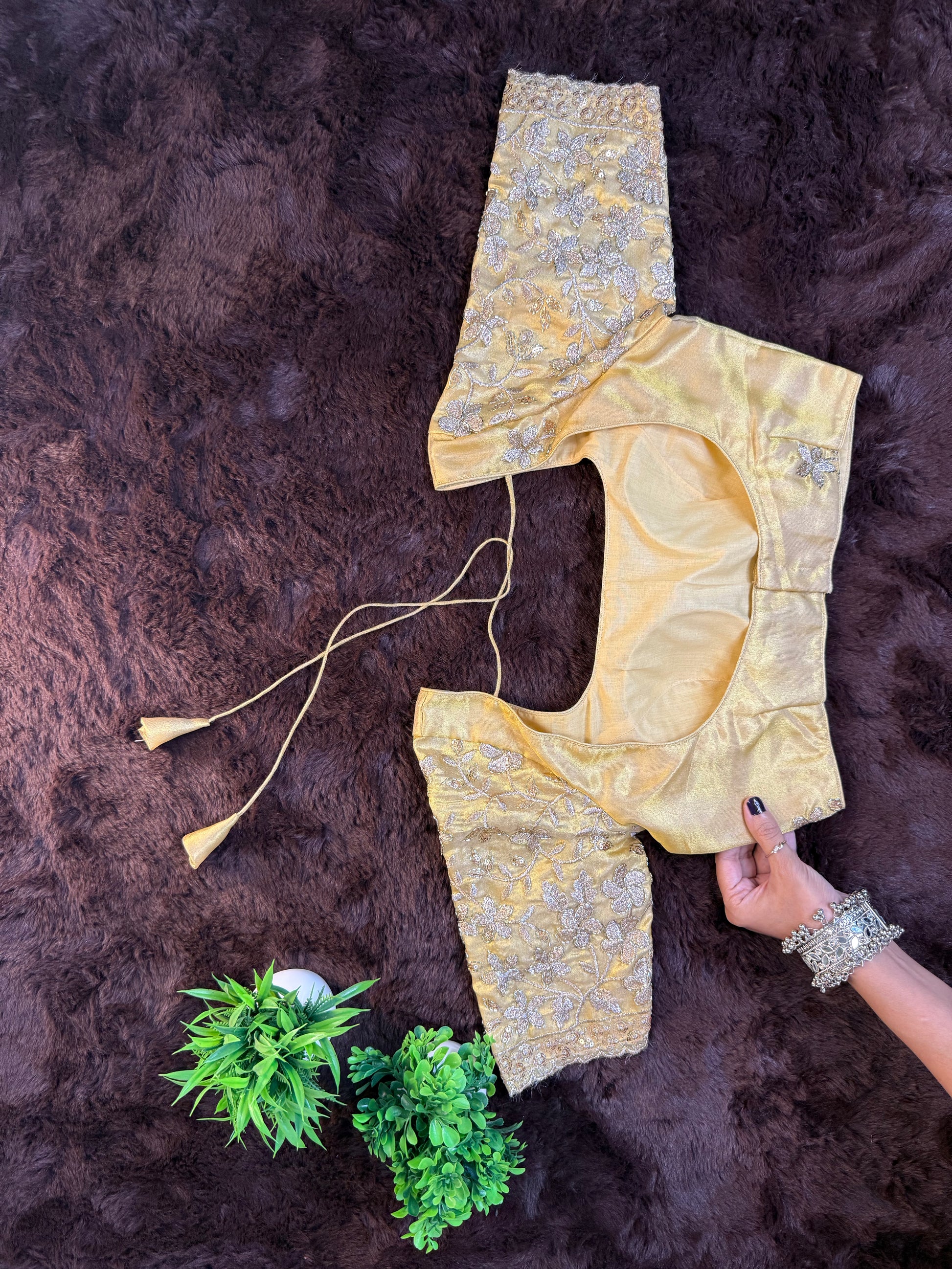 Buy Golden Tissue Blouse with Handwork and Elbow Sleeves
