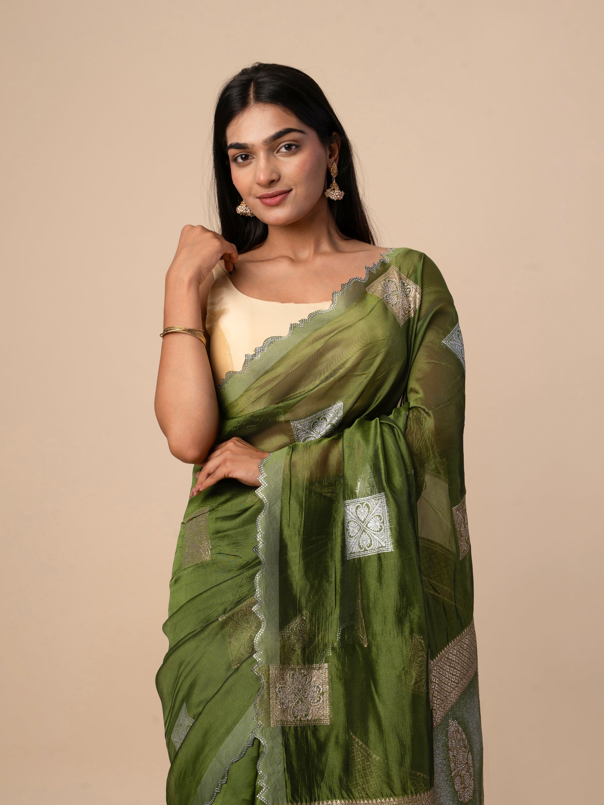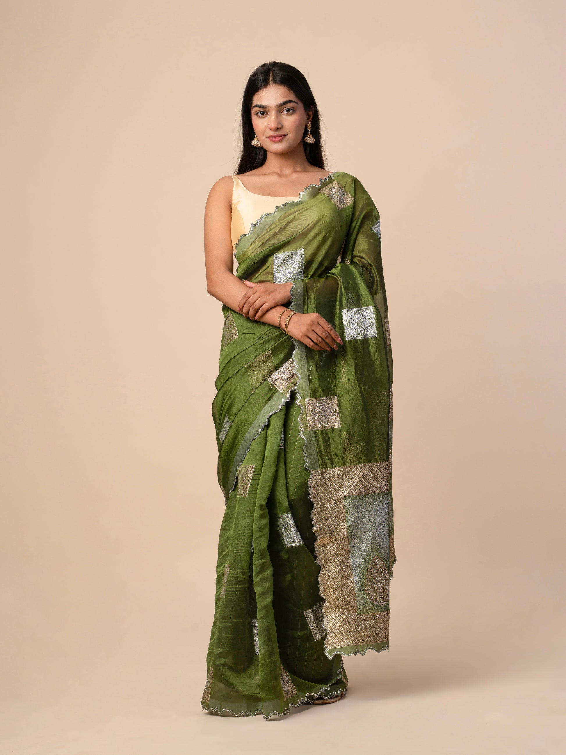 Design: Olive green base highlighted with intricate silver thread patch embroidery in traditional motifs, finished with a finely detailed golden zari scalloped border