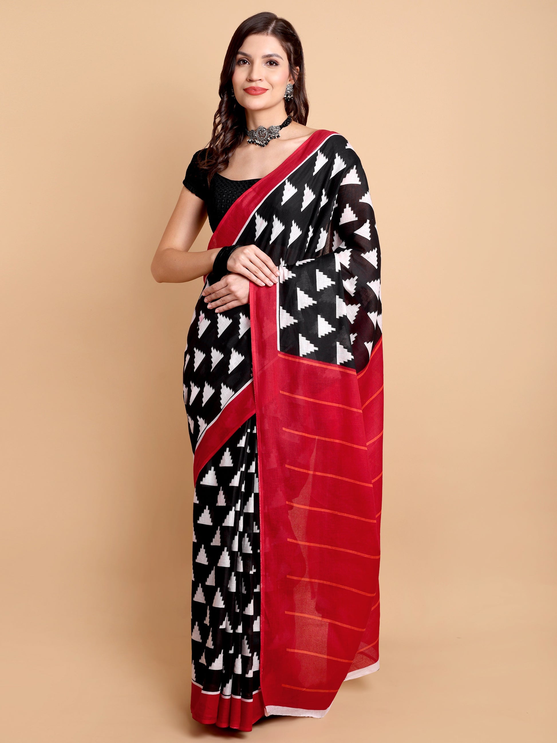 Black & Red Mul Mul Cotton Saree with Bold Geometric Triangle Print