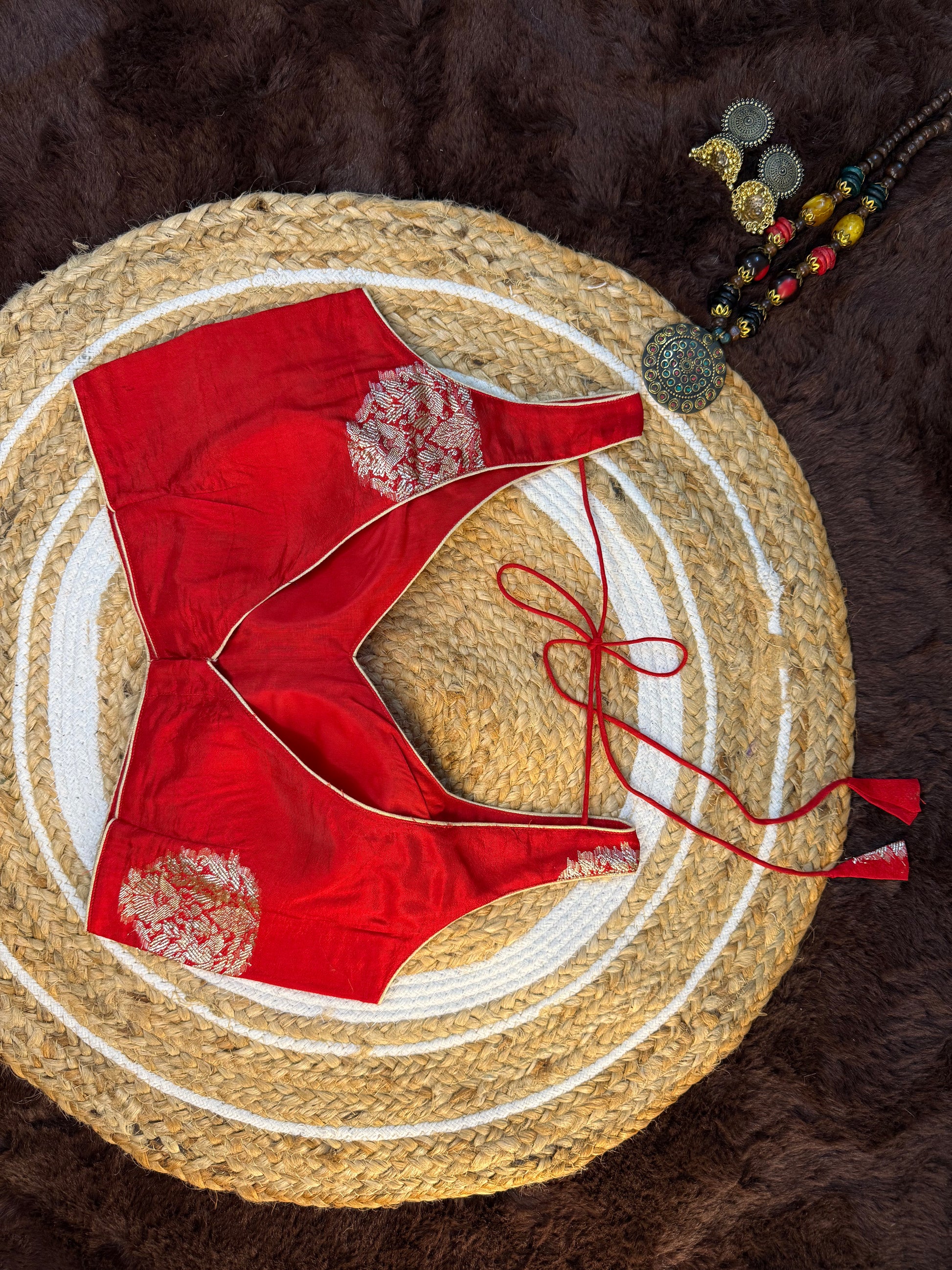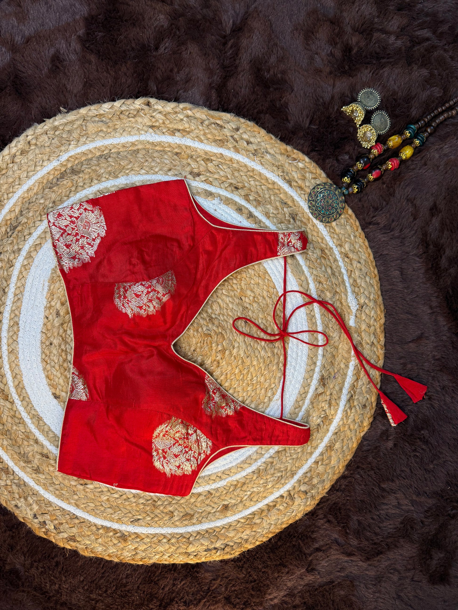 Regal Red Banarasi Silk Sleeveless Blouse with V-Neck and Heavy Zari Work