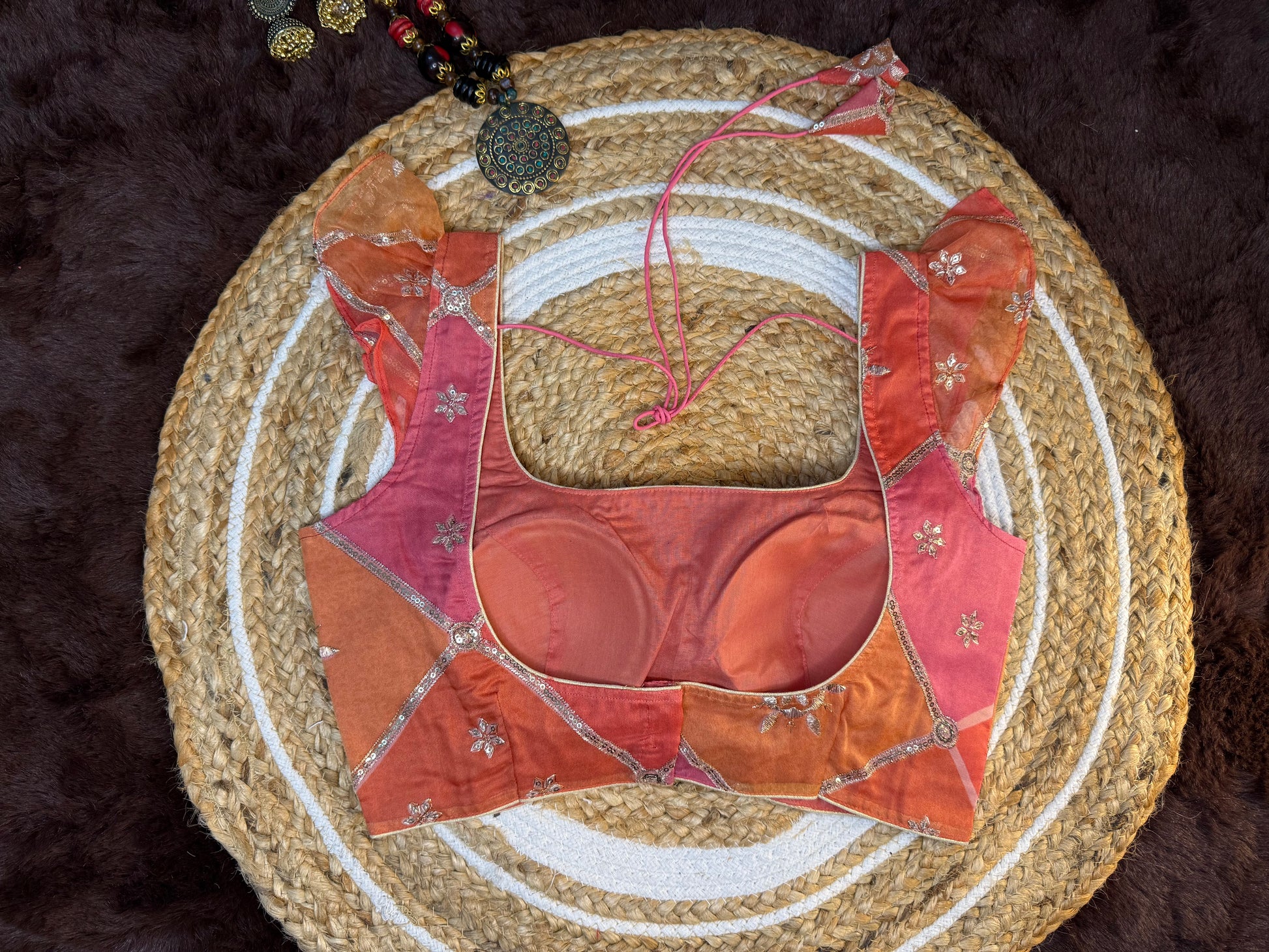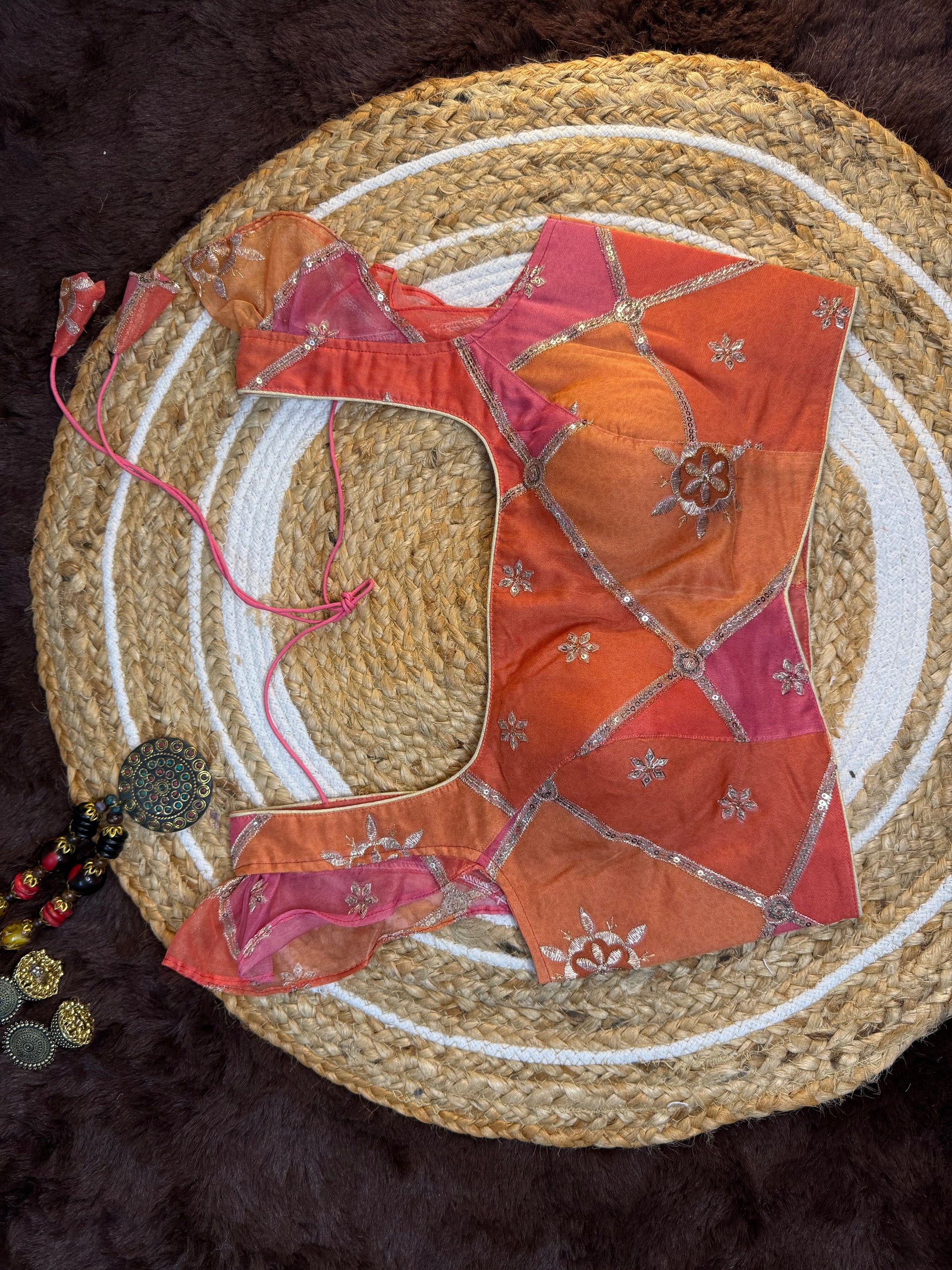 Buy Sunset Glow Ombre Organza Blouse with Ruffled Sleeves, Tie-Back Dori, and Tassels