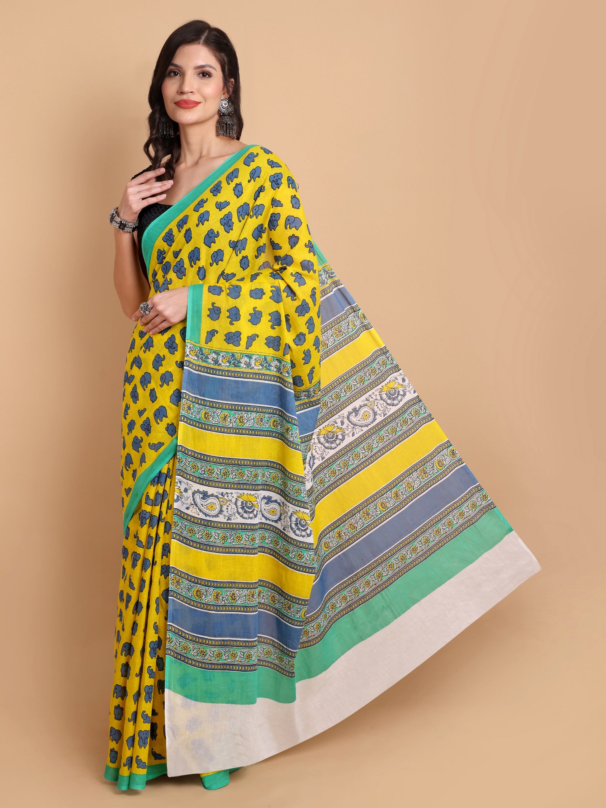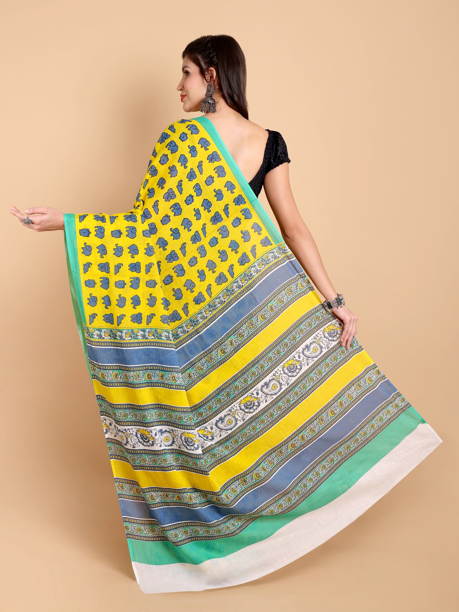 Design: Playful Blue Elephant Motifs on a Bright Yellow Base with a Multicolor Printed Pallu and Contrasting Green Border
